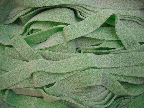 sugar, glucose-fructose syrup, wheat flour (contains gluten); acids: malic acid, citric acid; dextrose, palm fat, corn starch, flavourings; antioxidant: ascorbic acid; acidity regulator: potassium citrates; salt, colours: E100, E133.