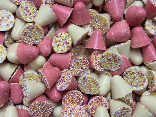 Sugar, vegetable fat (palm), whey powder (from milk), wheat flour (with calcium, iron, niacin, thiamin), wheat starch, emulsifier: rapeseed lecithin; glucose syrup, natural flavourings, natural colours: carmine, curcumin; glazing agent: beeswax; colouring foods: beetroot juice concentrate, spirulina extract.